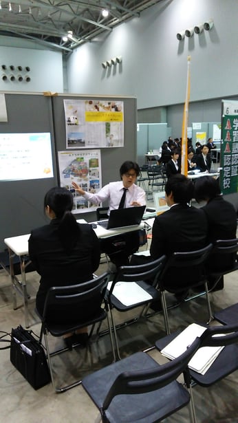 左は当社のブースです。学生さんに深沼部長が熱く語りかけています。