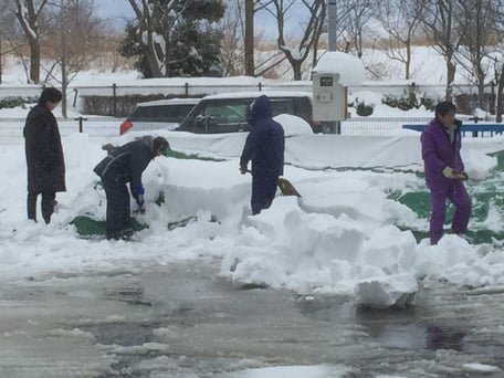 毎朝6時から早番の方が、事務所内、外の掃除をしながらお客様の応対をしていますが、冬場は除雪作業が加わります・・・今季最高の寒波で大雪になり、外の商品の上にも雪が積もりました。
