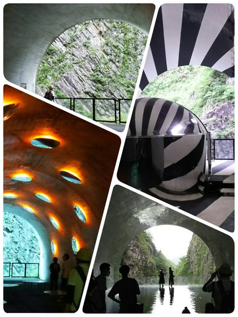光の洞窟・・パノラマステーションは清津峡の景観を反転して映す「水盤鏡」が幻想的な眺めをつくり出します。あそこで、ポーズを・・・と思ったのですが、恥ずかしいからやめました。というか・・・顔が見えないので、誰が立ってても同じですね(>_<)