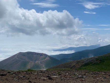 吾妻小富士の噴火口が雲海をバックにくっきり見えます。