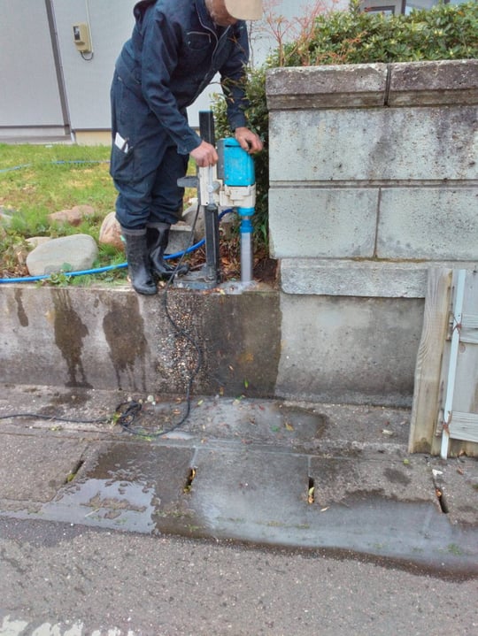 この作業を「コア抜き」と読んでいますが、左の写真のように専用のコアドリルという機械で凡そ65㎜Φのダイヤモンドコアを水を掛け乍ら、少しずつコンクリートに穴を開けていきます。