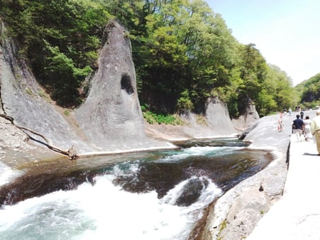 鱒飛びの滝、吹割の滝、般若岩、獅子岩などの岩壁群や奇景が、数十メートル続き独特の渓谷美で、