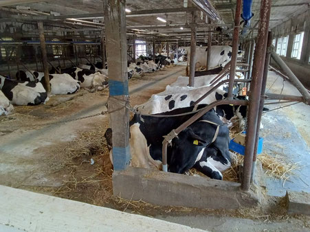 歴史散歩という事で、明治からの酪農風景の〔上丸牛舎〕へ行き、今も使われている牛舎へ入ると