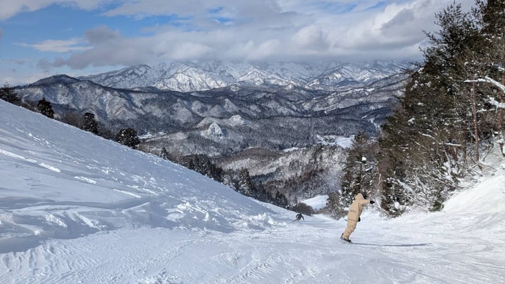 三川スキー場に積もった極上パウダーのおかげで、ブランクなんてどこ吹く風。スイスイ滑る娘の後ろ姿を、私は必死で動画撮影をして追いかけました(ゼェゼェ…🏃♂️📸)