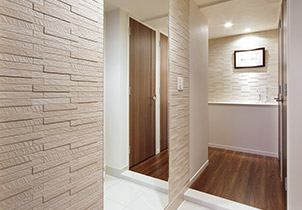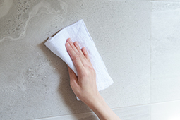 調湿建材ではむずかしかった、水拭きによるお手入れ。エコカラットプラスならできるんです。だから水まわりにも使いやすい。さらに、泥よごれ、皮脂よごれ、コーヒー染み、たばこのヤニなど。洗剤を使えば頑固なよごれもきれいに落とせます。いつもきれいにしたい場所は、お掃除も簡単に。