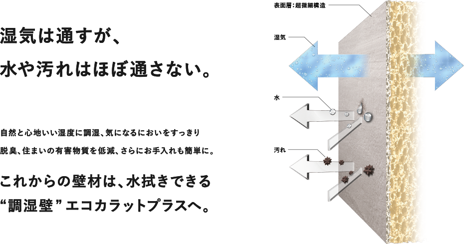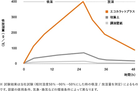 湿度が高い時は湿気を吸収し、乾燥している時は湿気を放出。エコカラットプラスは、すぐれた調湿性能で快適な湿度を保とうとします。その効果は珪藻土の約6倍、調湿壁紙の25倍以上もあるんです。だから結露を抑え、カビやダニの繁殖の抑制も期待できる。洗濯物の部屋干しにも、おすすめです。