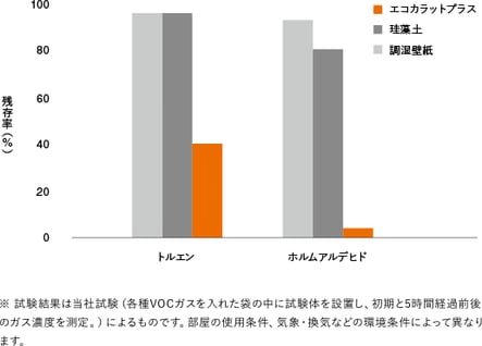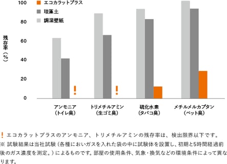 トイレ、生ゴミ、たばこ、ペット。ふだんの暮らしには、気になるにおいがたくさんある。エコカラットプラスはそれらにおいの原因となる成分を吸着。 珪藻土や壁紙より短時間ですっきり脱臭します。複数のにおいの成分が混ざった「複合臭」にも効果を発揮。住まいのあらゆる場所で活躍します。