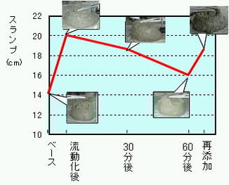 また、夏場のスランプロスによって打設時の作業性が低下した場合に、コンクリートの単位水量を変えることなく流動性の回復が行えます。