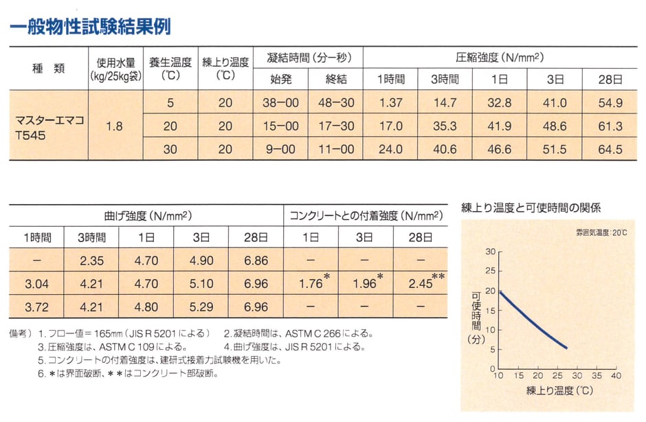 マスターエマコ T545は、セメント系や合成樹脂系の市販早強性補修材では得ることが難しい超早強性を有するほか、長期間にわたり安定した高強度を発現し優れた耐久性を保持します。