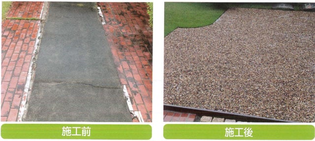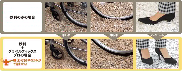 一見砂利道なのにとても歩きやすくなる画期的な砂利地盤安定材です。