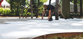 レーキを使用して丁寧に充填して下さい。不陸が無ければ無い程、施工後の落ち葉やゴミの掃除が軽減されます。