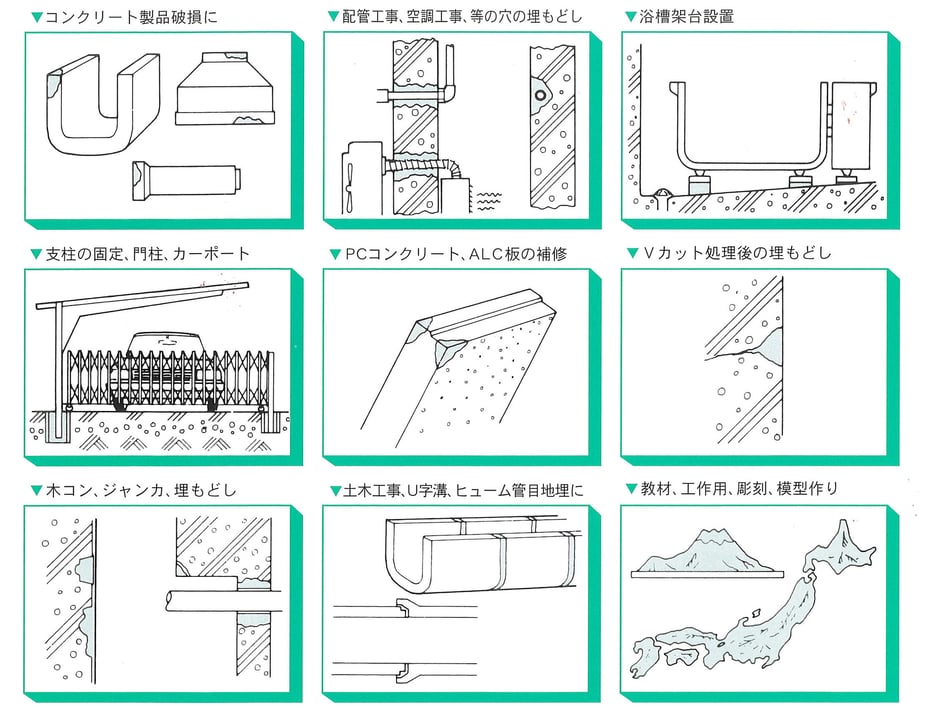 エレホン#415は、建物の破損箇所、設備工事の埋め戻し、及び各種コンクリート成形物の補修用に開発された高接着力を持つ既調合モルタルです。硬化時間の異なるMタイプとLタイプがあります。