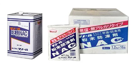 マノール粉末防凍剤NACは、鉄材を腐食・サビさせる原因となる塩化物を一切含有しない、完全無塩化・無アルカリタイプの早強・防凍粉末混和剤です。