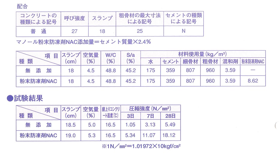 マノール粉末防凍剤NAC添加量=セメント質量×2.4%