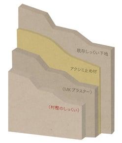 〈MKプラスター〉が十分に硬化乾燥後、《村怪のしっくい》を下付け、上付けで塗り付け、水引 き具合を見て仕上げてください(塗厚約1.5mm)。