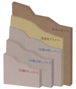 《村怪の砂しっくい》を下付け、上付けの2回塗りで5mm厚を限度とし所定の厚さまで塗り重ね、 荒らし目を入れ十分乾燥させてください。