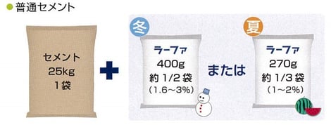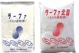 *生モルタル、生コンクリートに投入する場合は、ラーファを少量づつ(徐々に)振りまきながら投入するか、適量の水で溶いてミキサー車に投入し、高速回転で3分間以上の混練りをして20~30分以内で取り出してご使用ください。