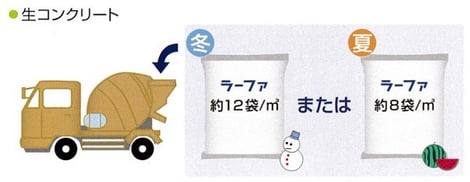 生コンクリート1㎥(セメント量330kg)に対して、ラーファ12袋(冬場)、または8袋(夏場)を現場でミキサー車に投入して、高速回転で3分間ドラムを廻してください。