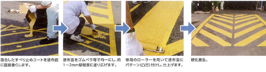 ●混合したすべり止めコートを塗布面へ置いてゆき、ゴムベラ等で均一に約1~2mm厚程度 に塗り広げてください。その後直ちに、専用ローラーを使いパターン(凸凹)付けして、仕上 げてください。