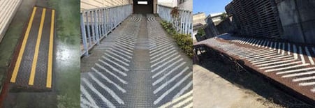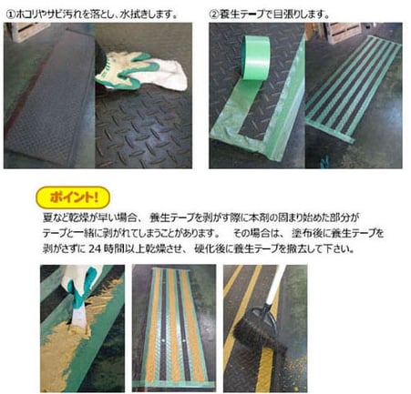 玄関、溝のフタ、グレーチング、坂道、踏み台の天板、仮設歩車道、向上などの設備内の安全用塗装、凍結しやすい路面