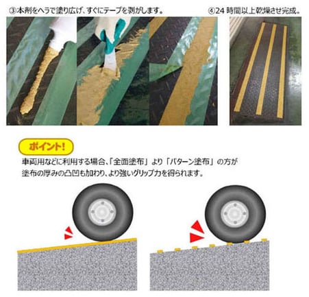 作業車などが通るハードな使用環境にも繰り返し使用可能! 摩耗して減っても上から必要箇所だけに再塗布できます。 古い部分を剥がす必要も無く、繰り返しのメンテナンス作業も楽々。