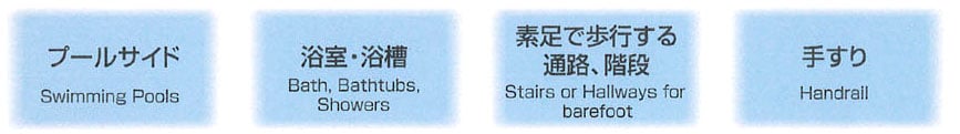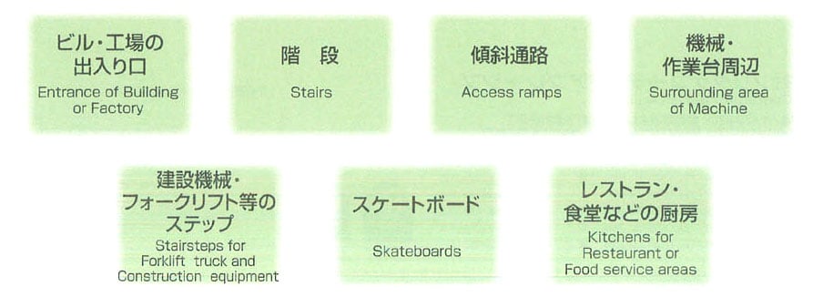 バスやフォークリフトなどのステップ部分や、ビル出入り口、工作機械周りの床、その他、水や油で滑りやすい箇所