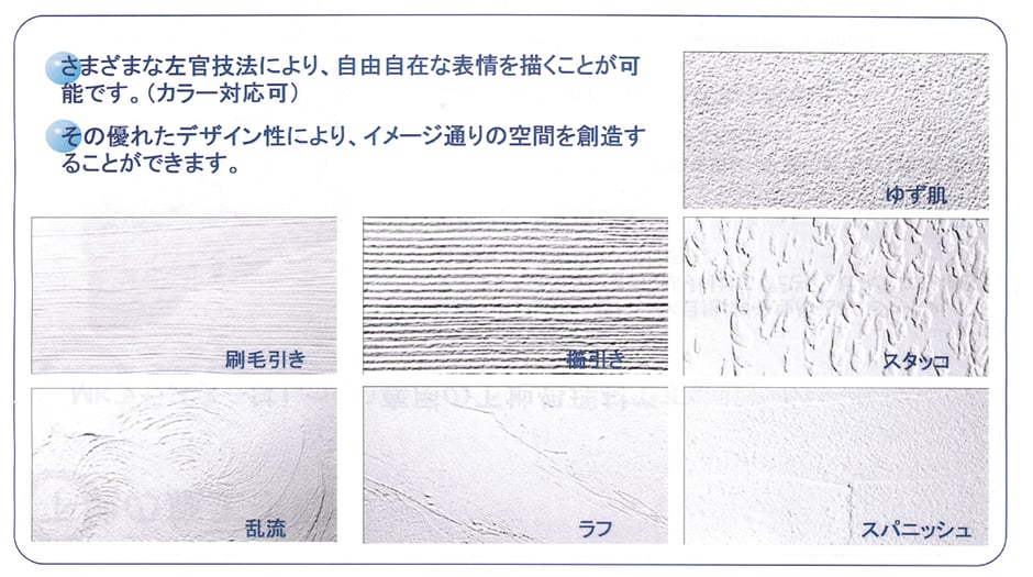 高温多湿な日本の気候風土に大変適した塗り壁材です。内壁材は吸放湿性能がたいへん高く、室内の湿気を吸収してくれます。