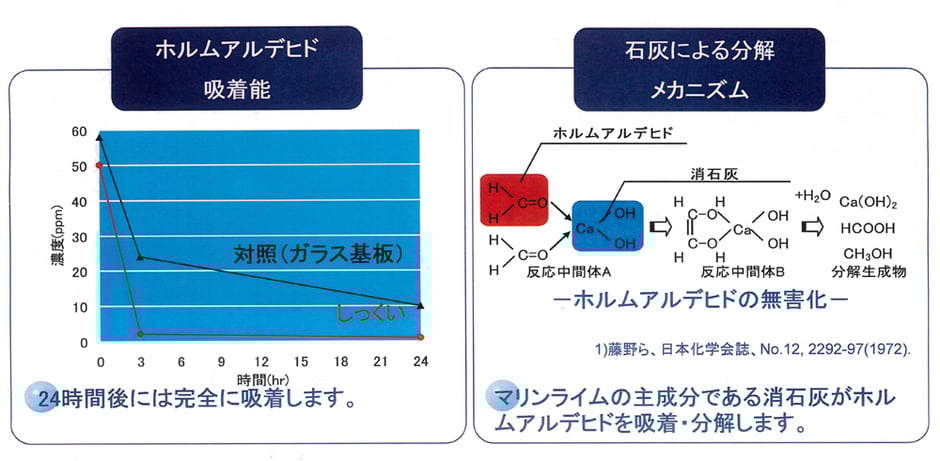 多孔質素材の壁材は、シックハウスの原因といわれるホルムアルデヒドやVOC揮発性有機化合物(トルエン、キシレン等)を吸着します。空気中の二酸化炭素との科学反応で長い年月をかけて石灰石に戻っていきます。そのため、主成分の水酸化カルシウムが石灰石に戻るまでの間(一般には100年ともいわれています)はホルムアルデヒドを絶えず吸着し、形成されるギ酸カルシウムを固定化し、再放出しない効果が得られます。