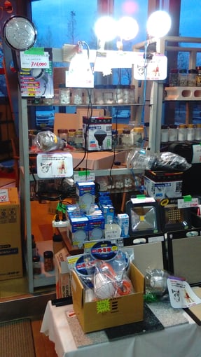 照明コーナーは11月より展示しているのですが、機械関係の担当の板垣さんの「LED電球の価格が下がってきたので、LEDを中心に売りましょう。そして、白熱灯や蛍光灯との違いが判り易いように、SW操作でそれぞれを点灯させて違いを分かるようにしてはどうでしょうか?」という提案で早速模様替えしたのが、左の写真です。SW操作で1灯、1灯を点けたり消したりできるので、その違いは一目瞭然です。