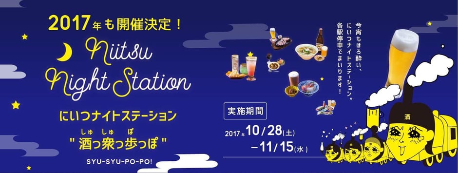 今年も呑み助お待ちかねの「にいつナイトステーション”酒っ衆っ歩っぽ”」が、今月26日(金)~11月14日(水)の間開催されます。今回は荻川地区も含め39店ものお店が参加します。回を重ねるごとに盛上がり今から楽しみです。